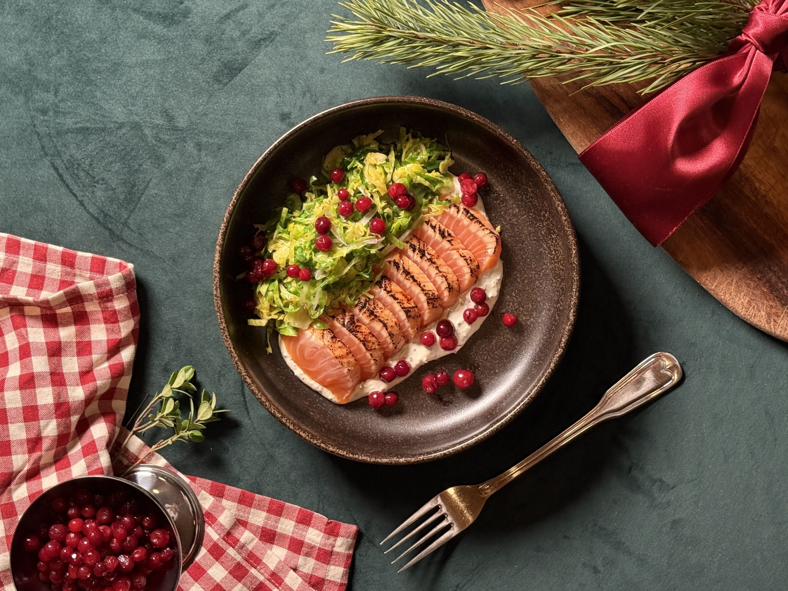 Casa Ricette Tataki con cavolini di Bruxelles arrostiti e salsa di panna acida Tataki con cavolini di Bruxelles arrostiti e salsa di panna acida 30 min Facile Antipasti Istruzioni Evitare che lo schermo si addormenti Procedura: Frullare il miele e la salsa di soia per ottenere una marinata. Spennellare il pesce con la marinata e lasciarlo per 15 minuti. Nel frattempo, scaldare un po' d'olio in una padella. Aggiungere gli scalogni, i cavolini di Bruxelles e un pizzico di sale. Soffriggere la cipolla e i cavoletti di Bruxelles per qualche minuto, finché le verdure non si saranno ammorbidite. Aggiustare di sale e limone. Mescolare la panna acida, la senape e l'aneto per ottenere un condimento. Condire a piacere con sale e pepe. Tagliare il pesce a fette. Utilizzare un coltello affilato e tagliare in una sola volta per ottenere una superficie di taglio pulita e ordinata. Fiammeggiare leggermente i tranci con un fornello a gas. Se non avete un fornello a gas, potete friggere rapidamente il pesce da entrambi i lati in una padella calda prima di tagliarlo a fette. Distribuire la crema di condimento sul piatto. Disporre le fette di salmone sopra il condimento, con i cavoletti di Bruxelles arrostiti a lato. Ricoprire con mirtilli rossi freschi e spruzzare un po' di salsa di soia sul tataki al momento di servire. Prodotti in questa ricetta Frøya Mezzo Back Loin 180g