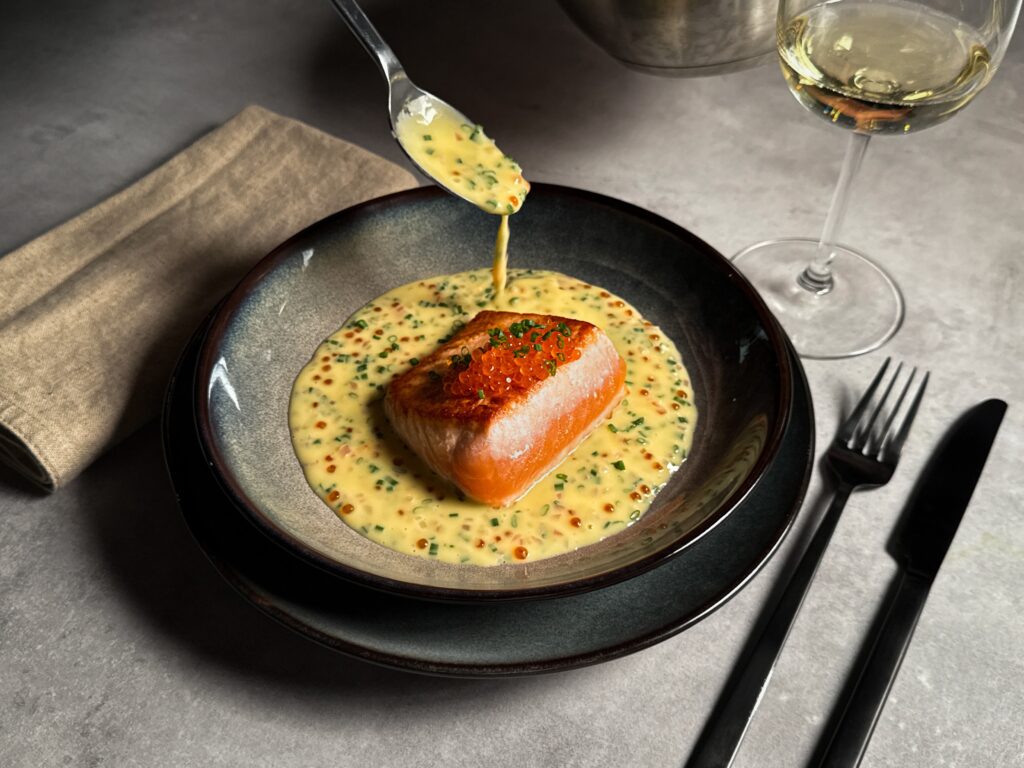 Pannestekt laks – gyllen og saftig, toppet med fyldig smørsaus, frisk gressløk og rogn.
