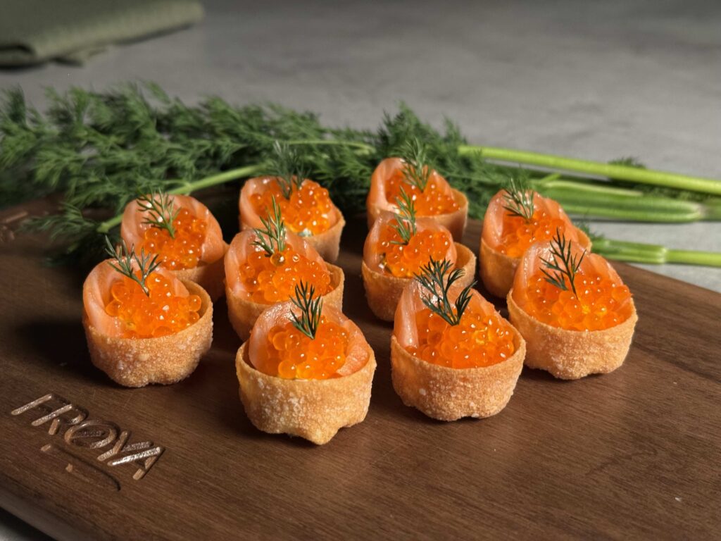 Sprø mini-krustader fylt med delikat laks i tynne skiver, kremet rømme- og kremostblanding med dill og gressløk, toppet med fyldig ørretrogn og frisk dill.